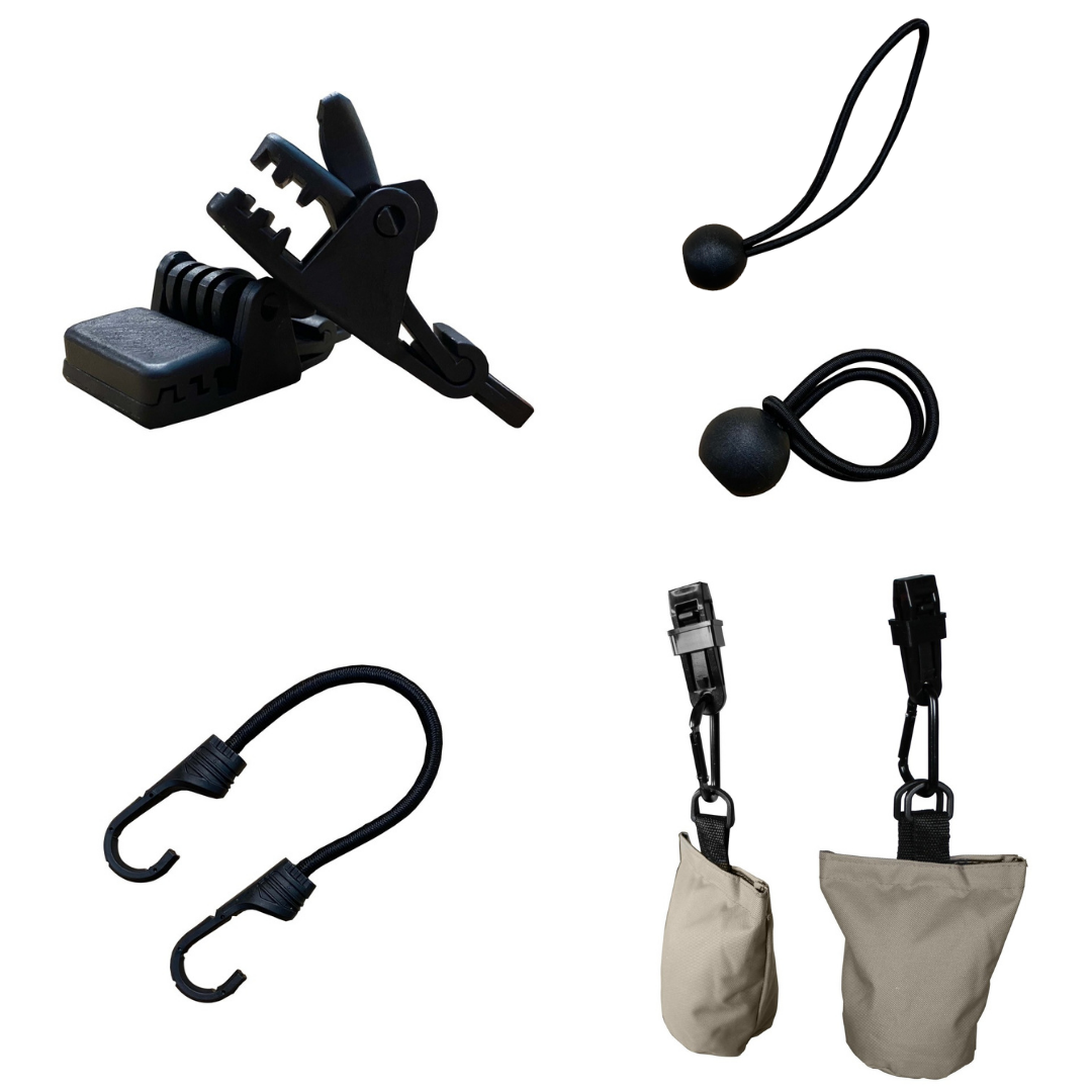 Se vores kategori med tilbehør, og vælg klemmer, kroge, elastiksnore, bungee-balls og sandsække.