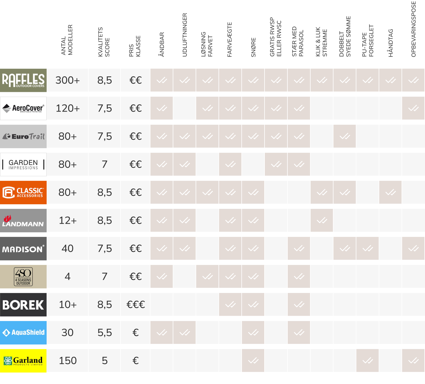 I tabellen nedenfor har vi placeret alle covers side om side, så du nemt kan se, hvilke specifikationer de forskellige mærker har.