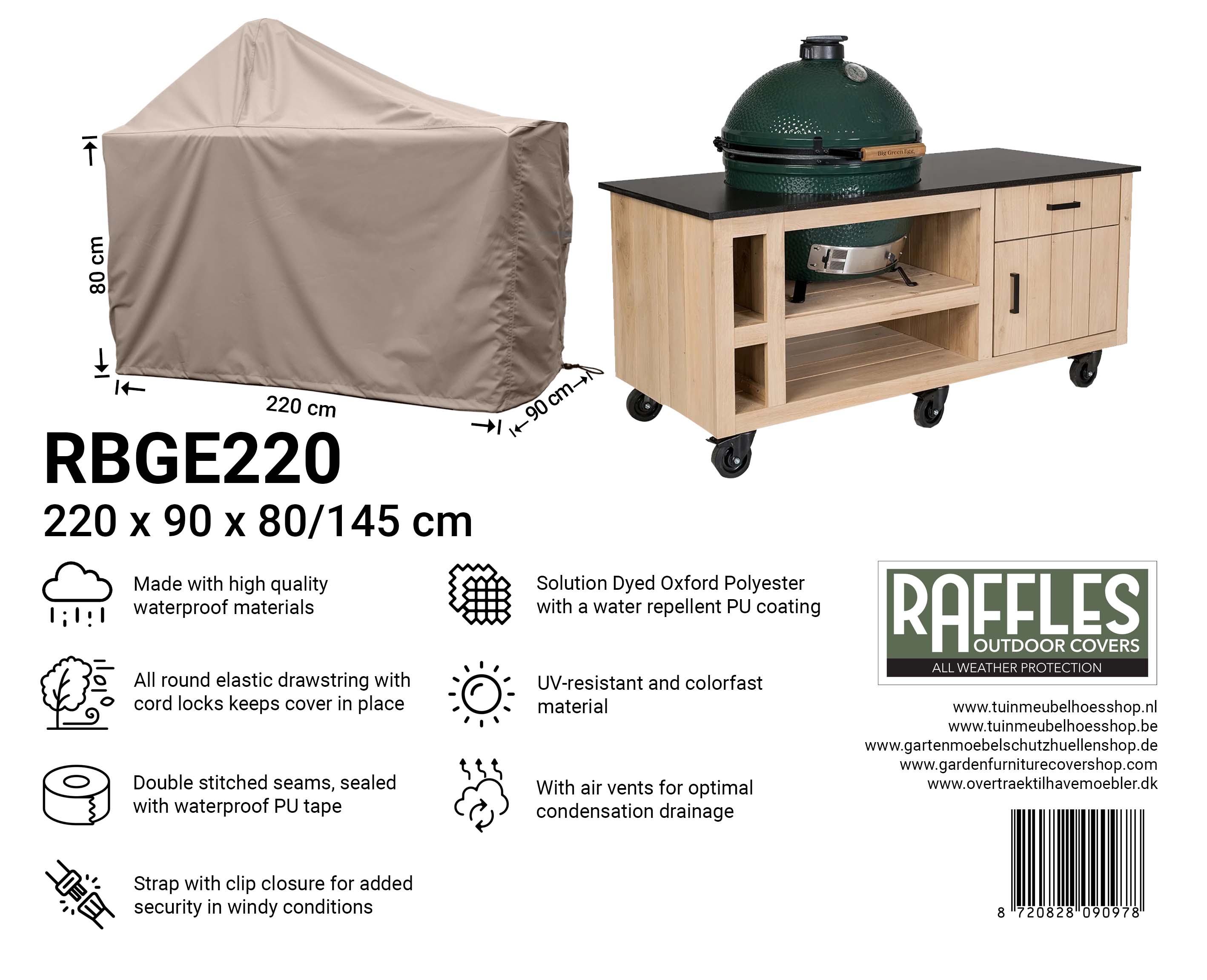 Med RBGE-serien af beskyttelsesovertræk fra Raffles Covers beskytter du både din kamado og hele bordet eller udekøkkenet på én gang. Overtrækkene er specielt udviklet til grill, der er indbygget i et arbejdsbord, et stel eller et specialbygget udekøkken, så bordplade, understel og grill dækkes samlet.