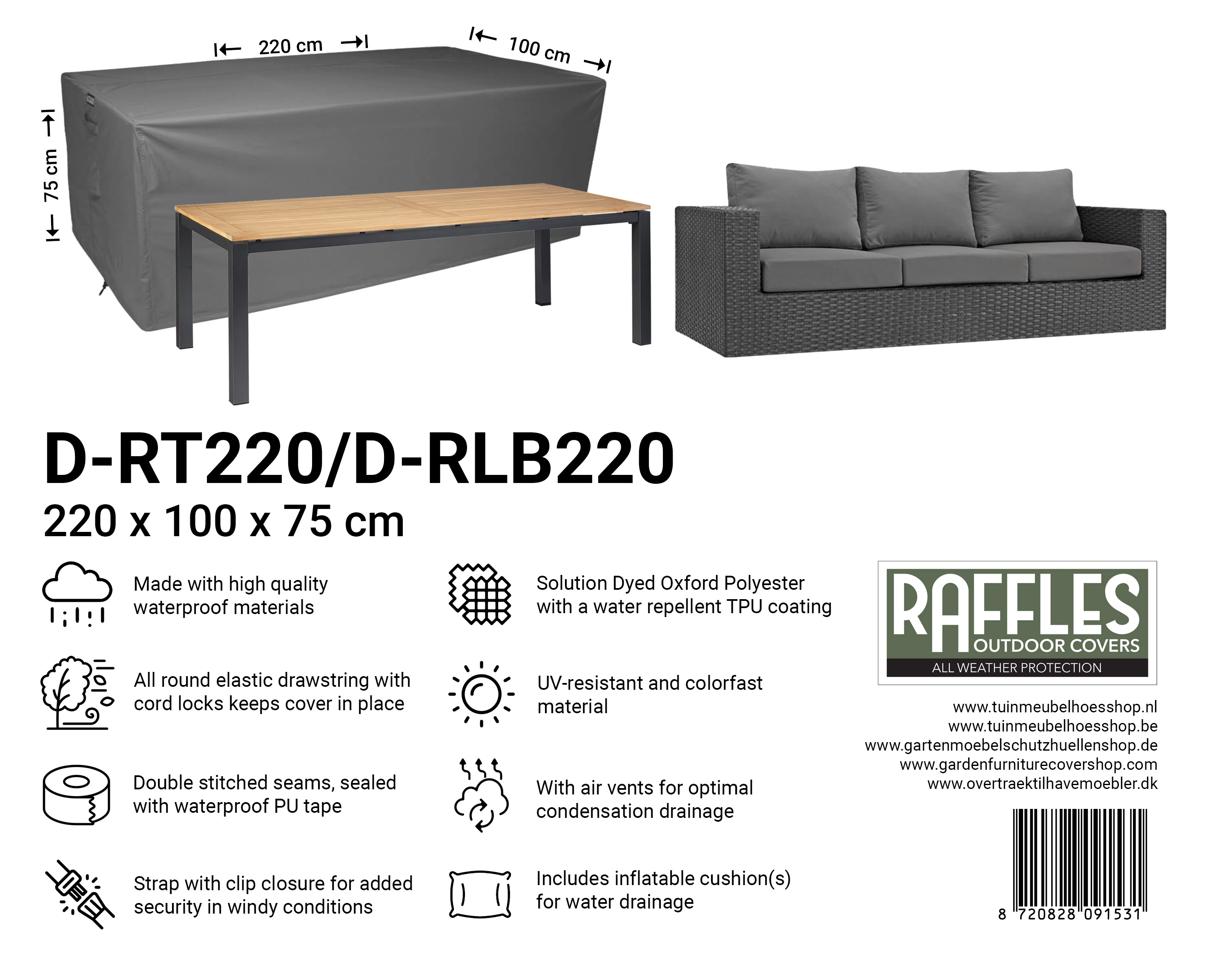 Med RT-serien af havebordsovertræk fra Raffles Covers beskytter du dine havebord(e) året rundt mod regn, sol, snavs, grønne alger, fugleklatter og UV-stråling. Uanset om du har et kompakt bistrobord, et standard rektangulært havebord eller et ekstra langt XXL-bord, findes der altid et passende overtræk, så dit bord forbliver rent og er direkte klar til brug.