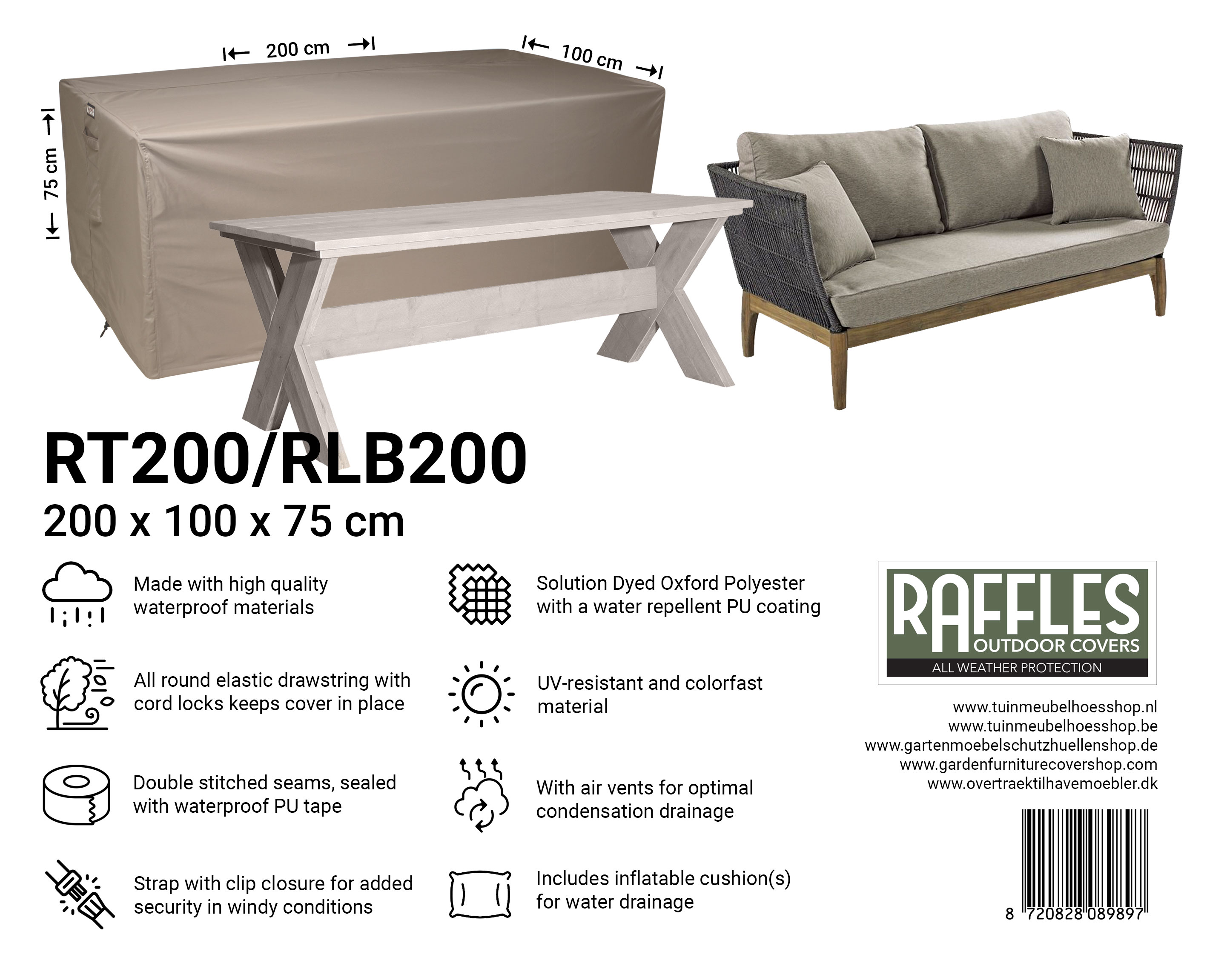 Med RT-serien af havebordsovertræk fra Raffles Covers beskytter du dine havebord(e) året rundt mod regn, sol, snavs, grønne alger, fugleklatter og UV-stråling. Uanset om du har et kompakt bistrobord, et standard rektangulært havebord eller et ekstra langt XXL-bord, findes der altid et passende overtræk, så dit bord forbliver rent og er direkte klar til brug.