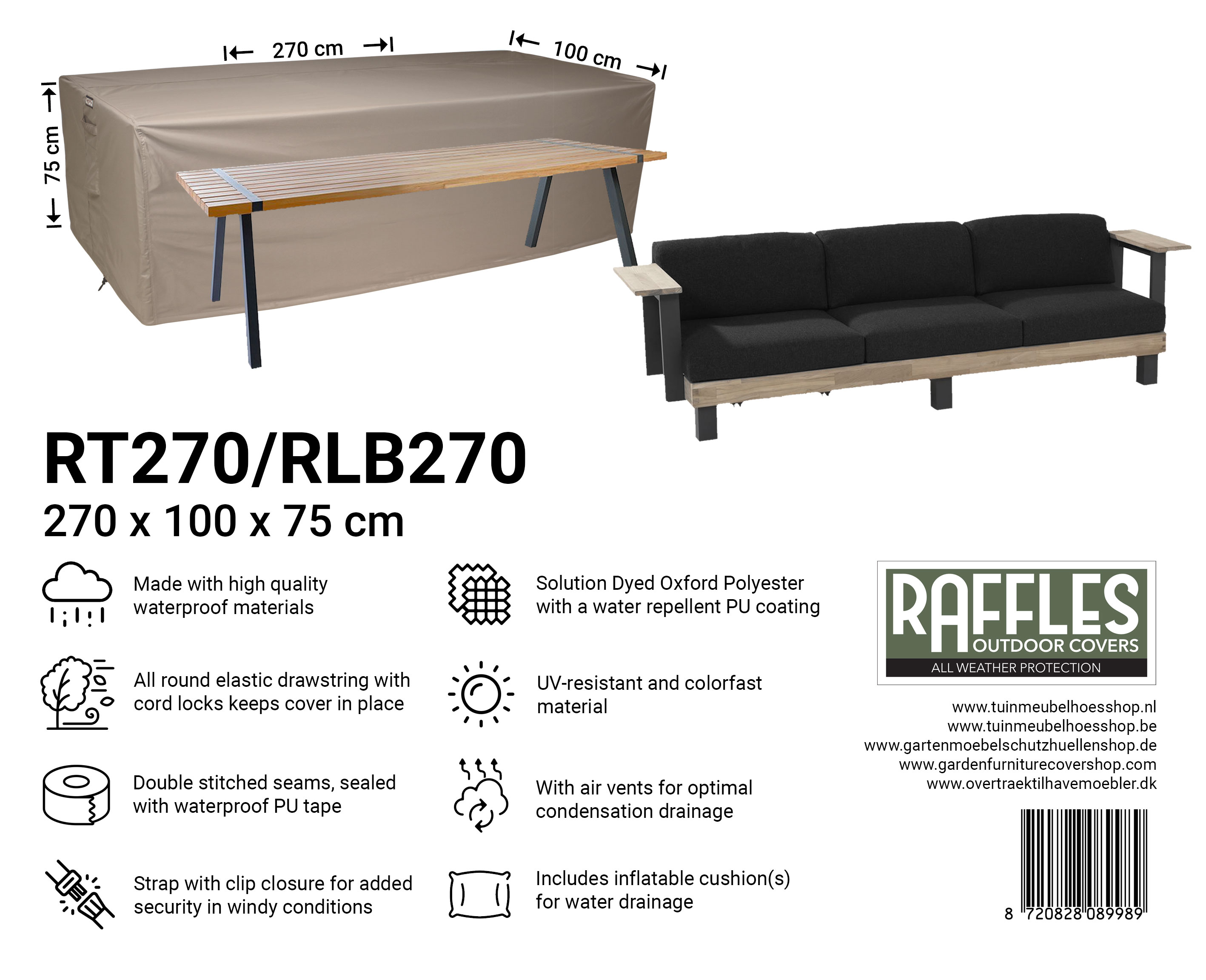 Med RT-serien af havebordsovertræk fra Raffles Covers beskytter du dine havebord(e) året rundt mod regn, sol, snavs, grønne alger, fugleklatter og UV-stråling. Uanset om du har et kompakt bistrobord, et standard rektangulært havebord eller et ekstra langt XXL-bord, findes der altid et passende overtræk, så dit bord forbliver rent og er direkte klar til brug.