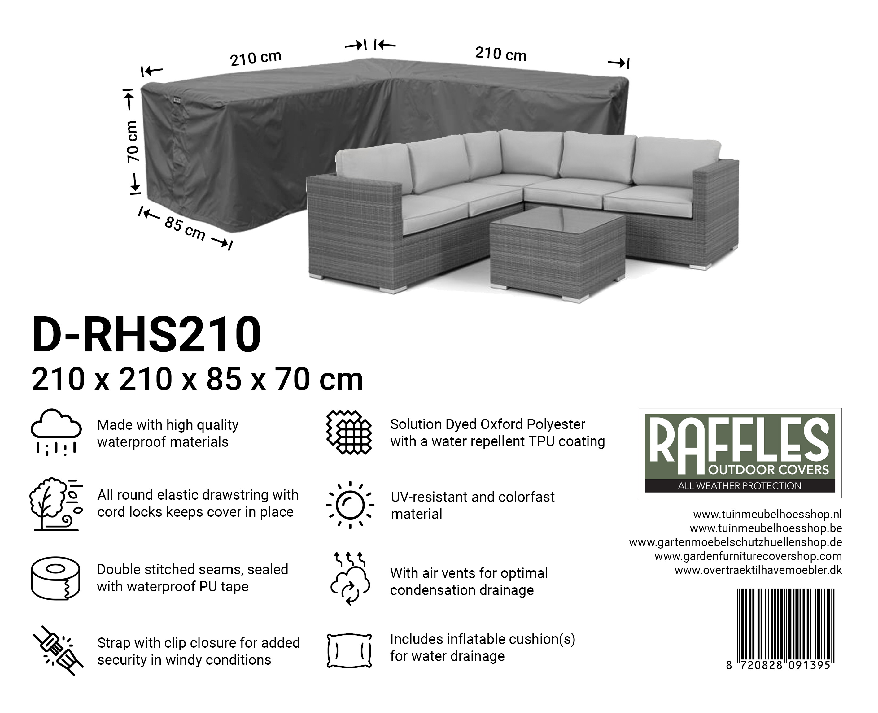 Med RHS-serien hjørnesofabetræk fra Raffles Covers beskytter du din lounge hjørnesofa eller L-formet loungesæt, fra kompakt til XXL, hele året rundt. Uanset om hjørnesofaen står på terrassen, altanen, under et halvtag eller frit i haven, er din sætopstilling beskyttet mod regn, snavs, grønne belægninger og sol.