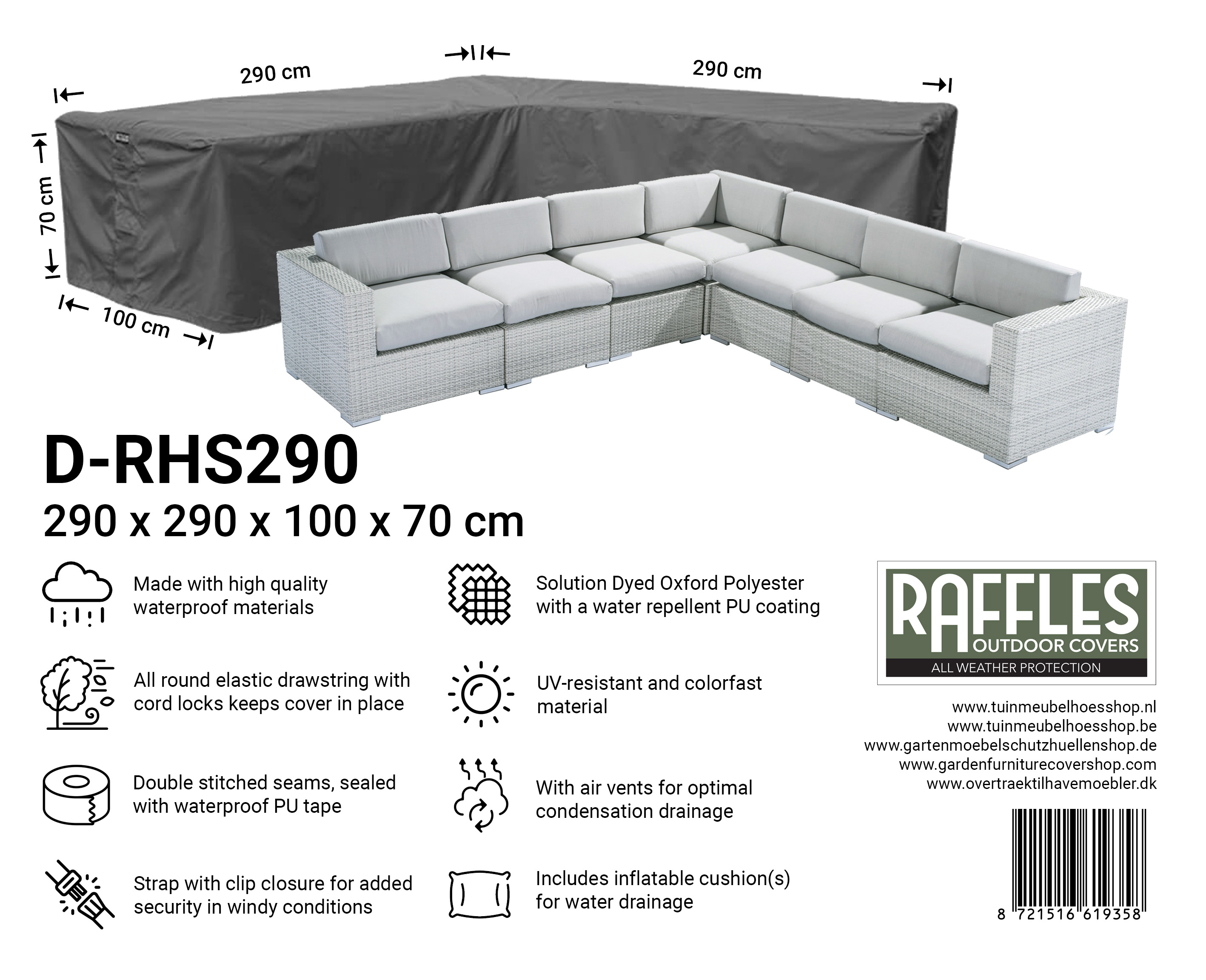 Med RHS-serien hjørnesofabetræk fra Raffles Covers beskytter du din lounge hjørnesofa eller L-formet loungesæt, fra kompakt til XXL, hele året rundt. Uanset om hjørnesofaen står på terrassen, altanen, under et halvtag eller frit i haven, er din sætopstilling beskyttet mod regn, snavs, grønne belægninger og sol.