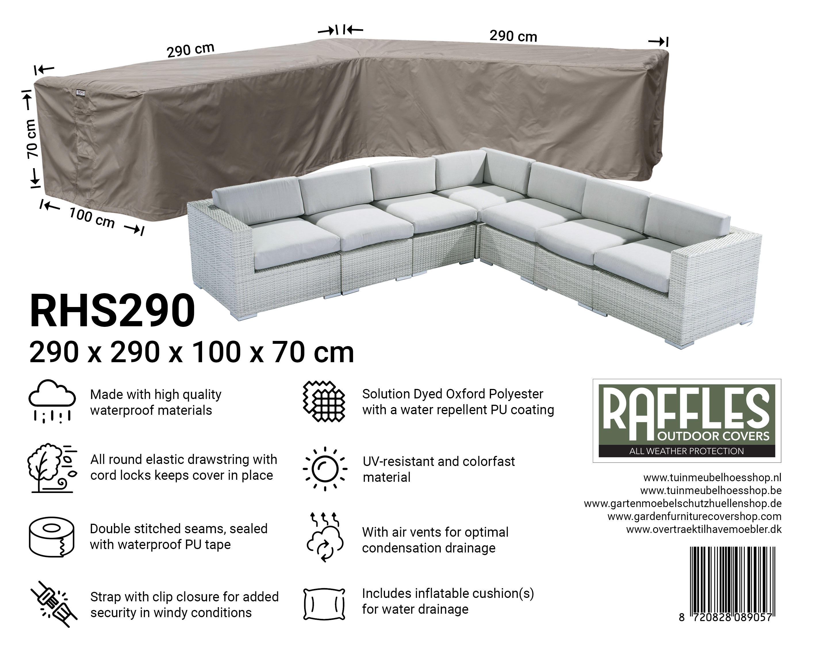 Med RHS-serien hjørnesofabetræk fra Raffles Covers beskytter du din lounge hjørnesofa eller L-formet loungesæt, fra kompakt til XXL, hele året rundt. Uanset om hjørnesofaen står på terrassen, altanen, under et halvtag eller frit i haven, er din sætopstilling beskyttet mod regn, snavs, grønne belægninger og sol.