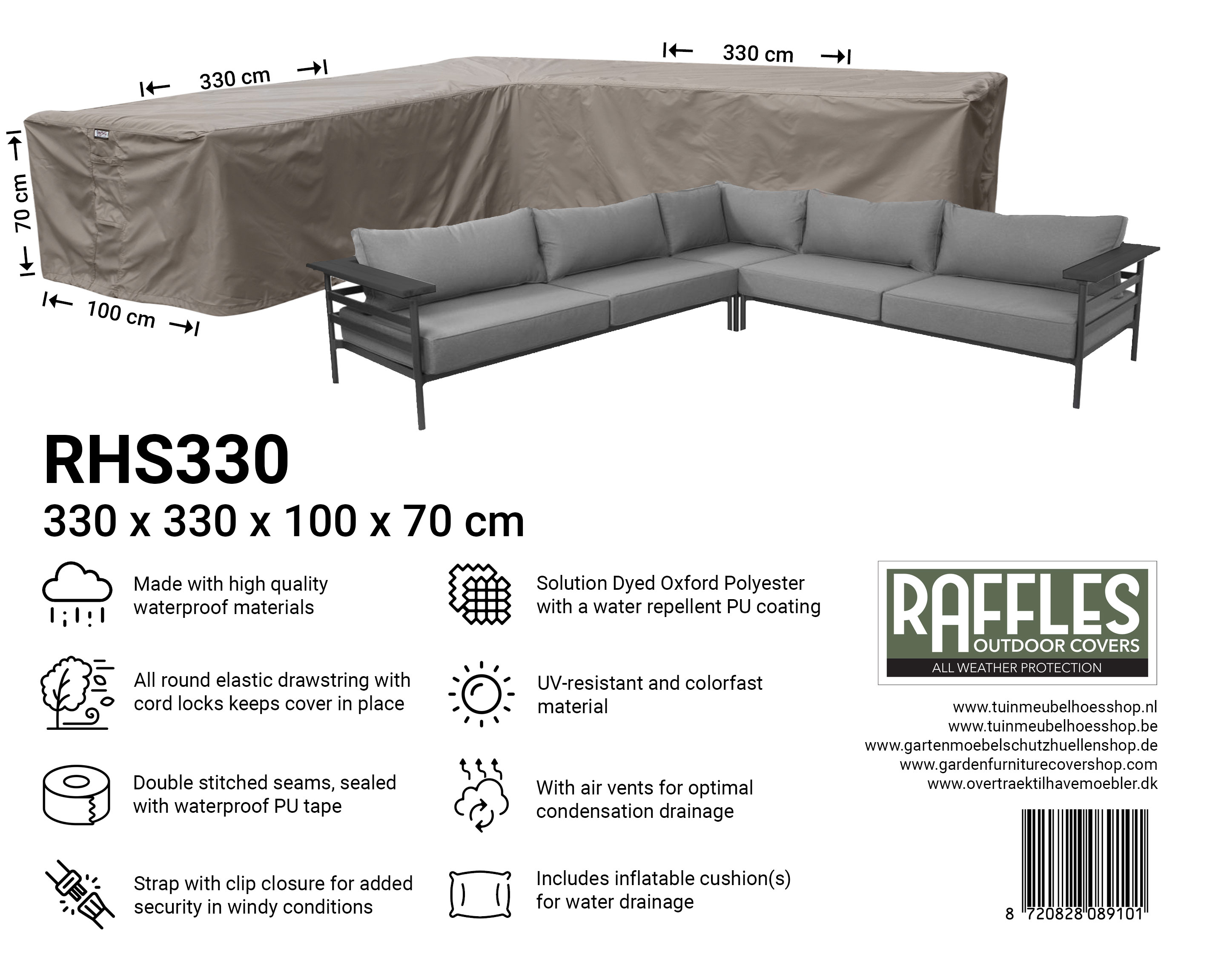 Med et Raffles Covers hjørnesofabetræk fra RHS-serien giver du din lounge hjørnesofa en professionel helårsbeskyttelse: ren, tør og klar til brug, år efter år.
