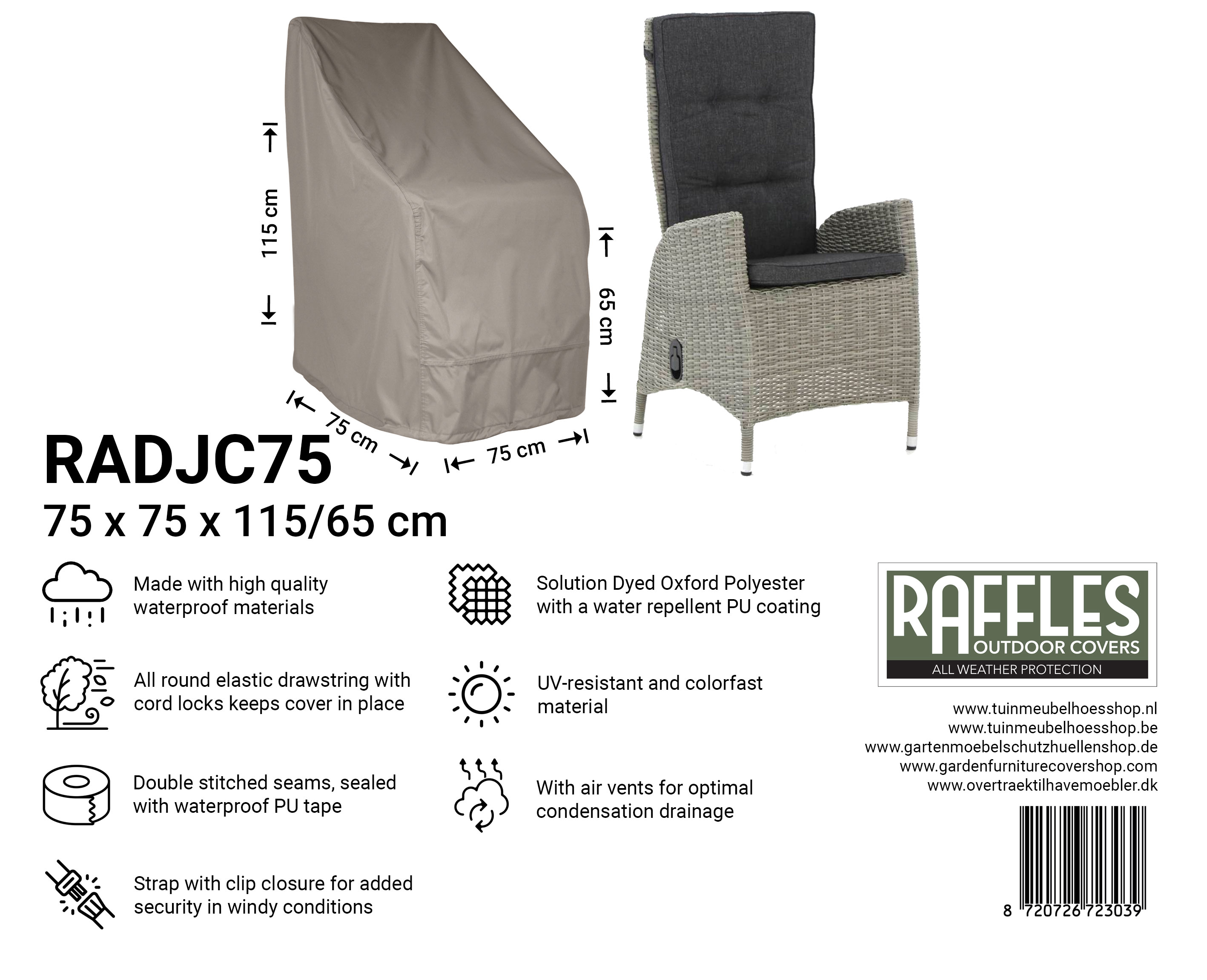 Pasformen i RADJC-serien er tilpasset justerbare loungestole med høj ryg og eventuelt en separat fodskammel. Overtrækket falder generøst ned over ryg- og armlæn og dækker stolen næsten helt ned til jorden. Nederst slutter det godt til hele vejen rundt, så vinden får mindre fat, og overtrækket bliver pænt på plads, samtidig med at du hurtigt kan tage det af og på.