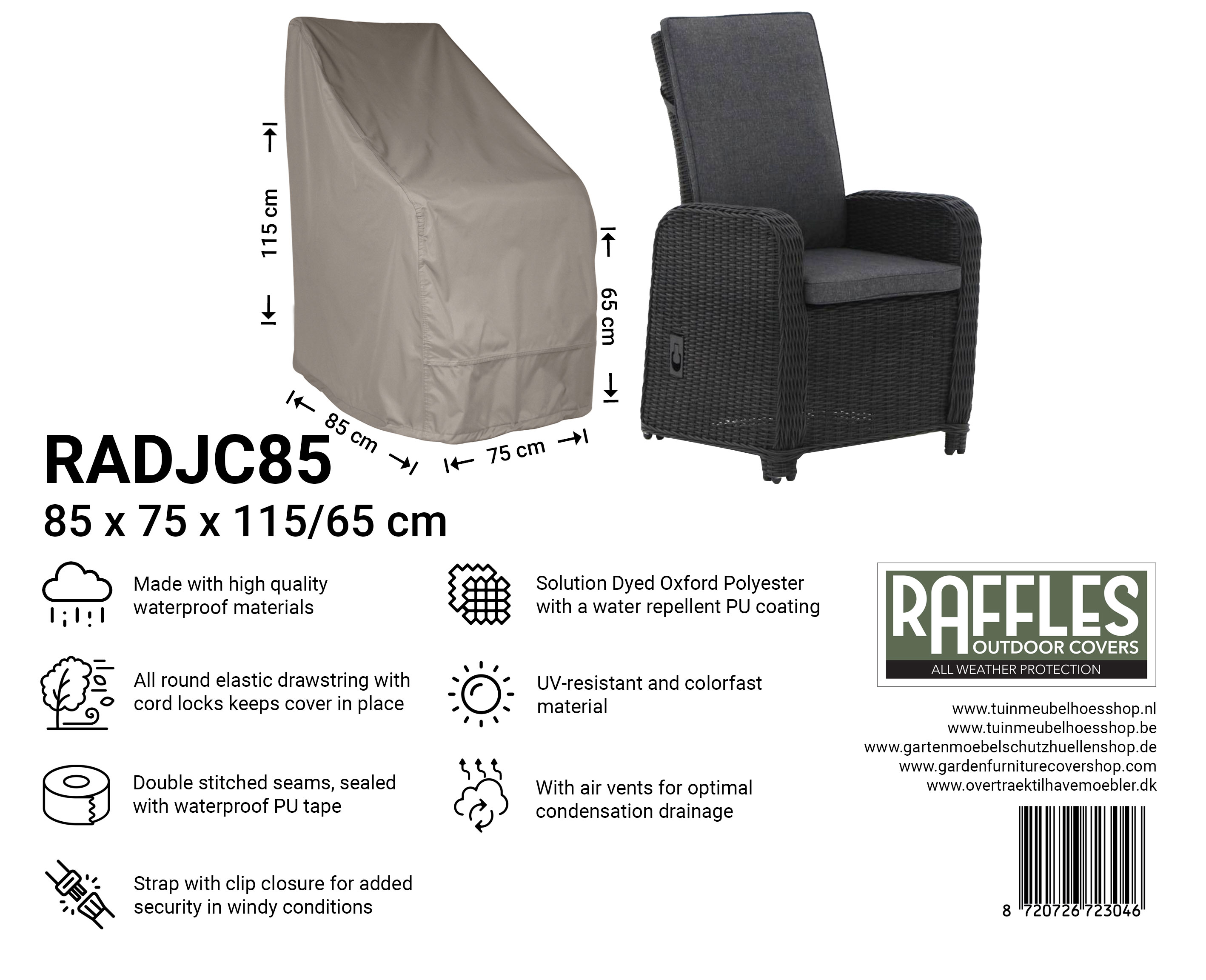 Pasformen i RADJC-serien er tilpasset justerbare loungestole med høj ryg og eventuelt en separat fodskammel. Overtrækket falder generøst ned over ryg- og armlæn og dækker stolen næsten helt ned til jorden. Nederst slutter det godt til hele vejen rundt, så vinden får mindre fat, og overtrækket bliver pænt på plads, samtidig med at du hurtigt kan tage det af og på.