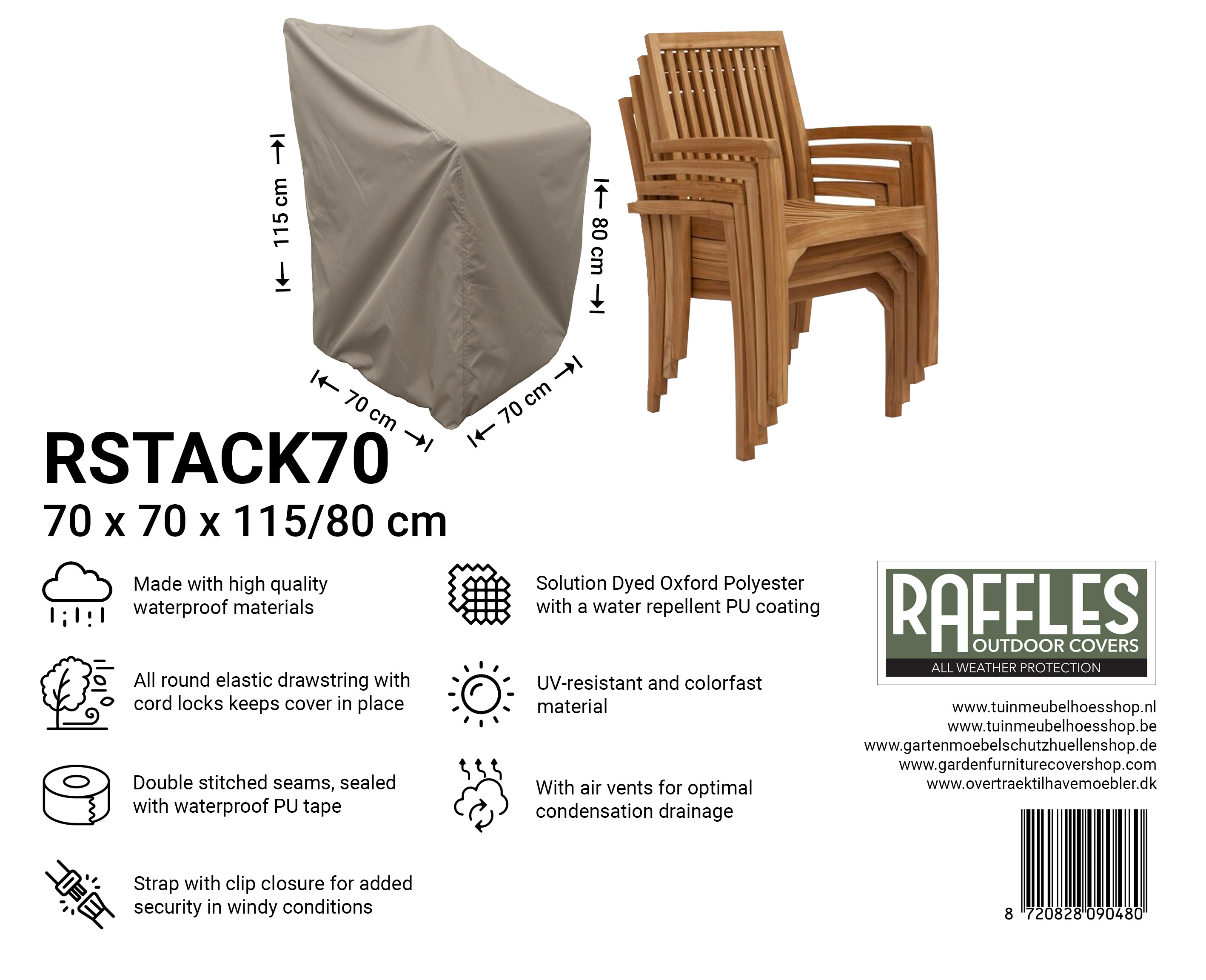 Med de RSTACK-serien stabelstolsovertræk fra Raffles Covers beskytter du flere stabelstole på én gang mod vejr og snavs. Uanset om du har en kompakt stabel med 4 stole eller en højere stabel på op til ca. 8 stole, findes der altid et passende overtræk, der beskytter dine stole mod regn, sol, sne, snavs, grønne alger og fugleklatter.