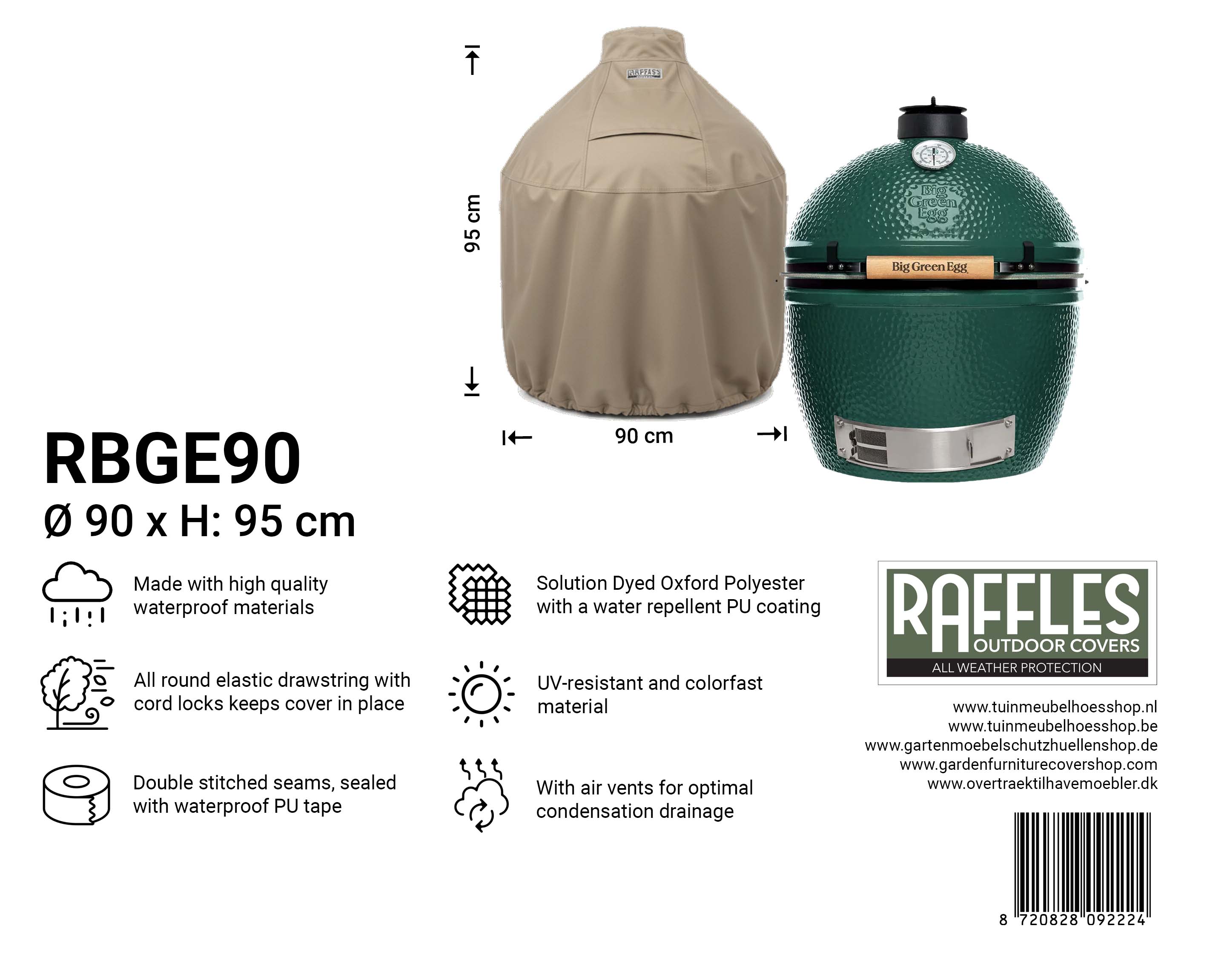 Raffles Covers RBGE-serien er specielt udviklet til runde kamado-grill, såsom Big Green Egg, Kamado Joe, The Bastard, Grill Guru, Monolith, Primo og tilsvarende mærker. Uanset om din kamado står frit, i et Nest på hjul eller er bygget ind i et udekøkken, findes der i denne serie altid et overtræk, som passer til diameter, højde og opstilling.